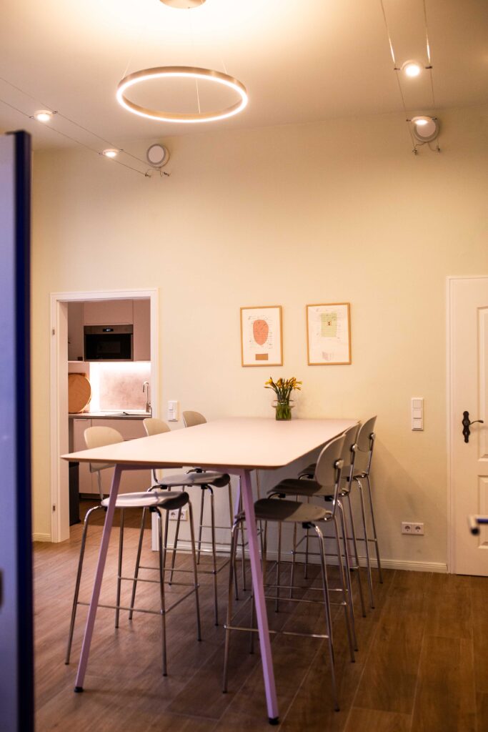 Auf rund 19 qm findest du 6 Barhocker, einen Stehtisch und eine kleine Sitzecke – offen gestaltet und direkt an die Teeküche angebunden. Dort stehen dir eine Kaffeemaschine und ein Kühlschrank zur Verfügung – ideal für Selbstversorgung, Catering oder einfach entspannte Pausen.